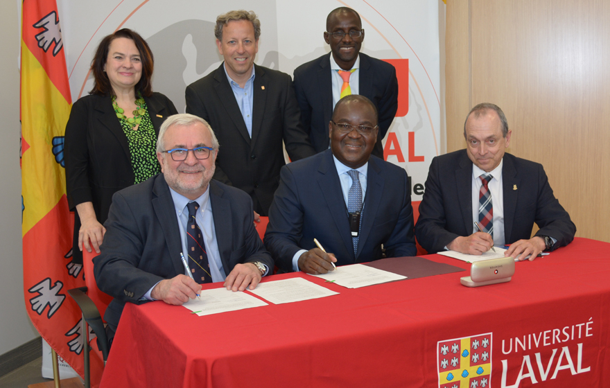 Première rangée : Bernard Garnier (vice-recteur aux études et aux activités internationales), Edoh Kossi Amenounve (directeur général de la BBRVM) et Michel Gendron (doyen). Deuxième rangée : Nicole Lacasse (vice-rectrice adjointe aux études et aux activités internationales), Bruno Déry (président et chef de la direction du Collège des administrateurs de sociétés) et Issouf Soumaré (directeur des relations internationales).